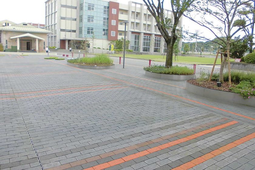 使用したレンガは主に ワイド230透水厚み40mm、 色はGE・IE・LE・RE・ME 広大な敷地には、学生が屋外でくつろぐスペースが設けられ自然と一体になれる空間がつくられています。透水性レンガを使用した事で、広い敷地に降る雨水を地下に浸透させてます。