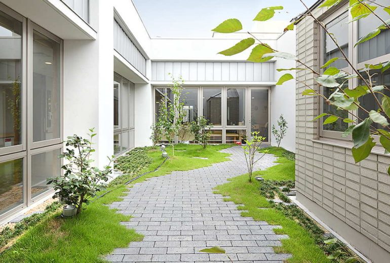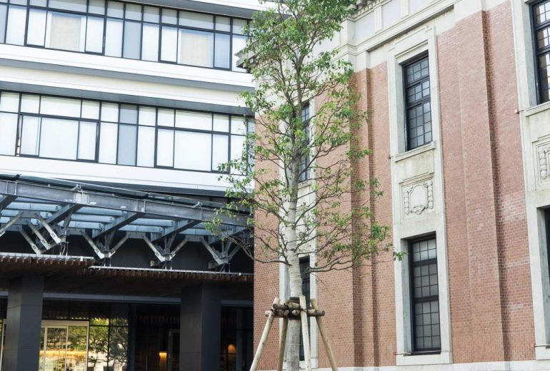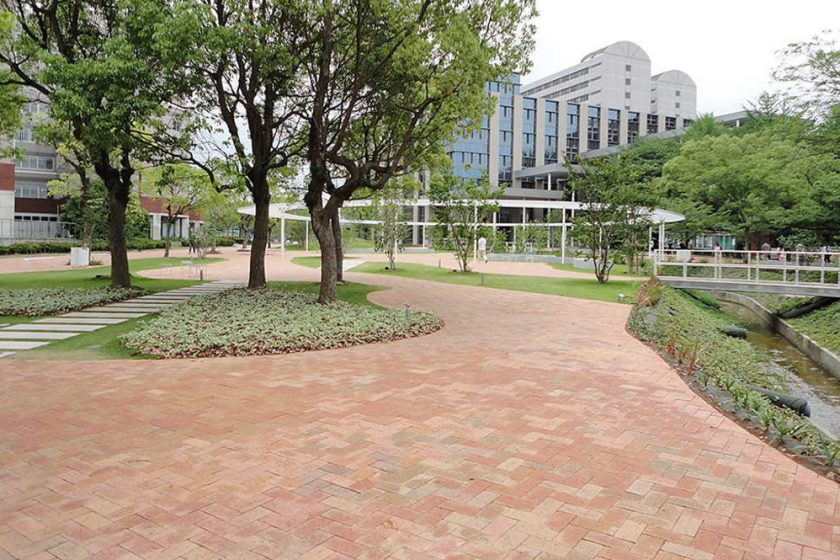 アスファルトだった歩道を女子学生が歩きたくなるキャンパスにしたい!という要望から、原料からレンガをチョイスしました。通常の赤レンガより柔らかいピンクオレンジ色を基調とした色になっており、その焼きムラが舗装の広い面に表情をつくりました。また、真夏でも暑くなりにくい保水性の機能があるので、屋外イベントがあるときは緑地を眺めながら自然を感じる空間づくりとなりました。