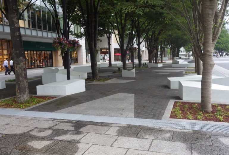 使用しているレンガは300角厚み60mmを使用。色は協調しすぎず、車の乗り入れ痕がわかりにくい グレー(GE)を基調にイブシ(IE)とライト(LE)・レッド(RE)をデザインとして入れました。各横断歩道には町のキャラクターを彫ったレンガで町をアピールしてます。
