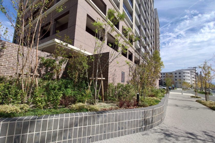 花壇の壁に新燃レンガタイル ルネッサンスを使用。躯体に貼り付けて施工。植栽を目立たせる抑えめの配色で、景観・雰囲気を向上させます。また、舗装の見切り部分などにもライン状にご使用いただいています。