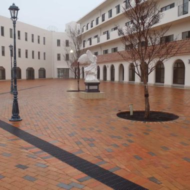 滑り抵抗値が高く透水性も高いため、雨の日などの歩行にも安全。また、色によるすみ分けもされているため避難誘導にも優れています。そして、遮熱性もありヒートアイランド現象抑制の効果もございます。